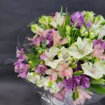Букет с тюльпанами, пионовидными розами,матиолой,эустомой и альстромерией