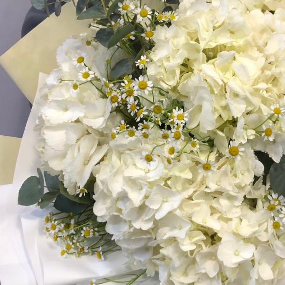 Гортензия – 3 шт.Матрикария – 6 шт.Эвкалипт – 3 шт.Корейская упаковка – 2 шт.бант атласный – 1 шт.