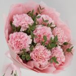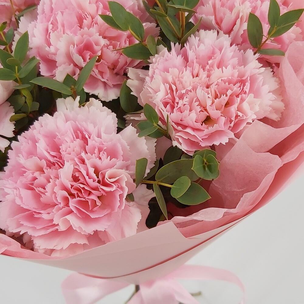 Нежный и стойкий букет из сортовых розовых динтусов и эвкалипта в стильной упаковке в тон. Такой букет всегда уместен и подойдёт для любого повода: День Рождения, именины, годовщина свадьбы, рождение ребенка, 8 марта, День Святого Валентина, выпускной и т.д. Можно вручить маме, сестре, подруге, коллеге, учителю, любимой.