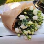 Красивый букет белоснежных эустом, оформленный во флористическую кальку светлых оттенков.