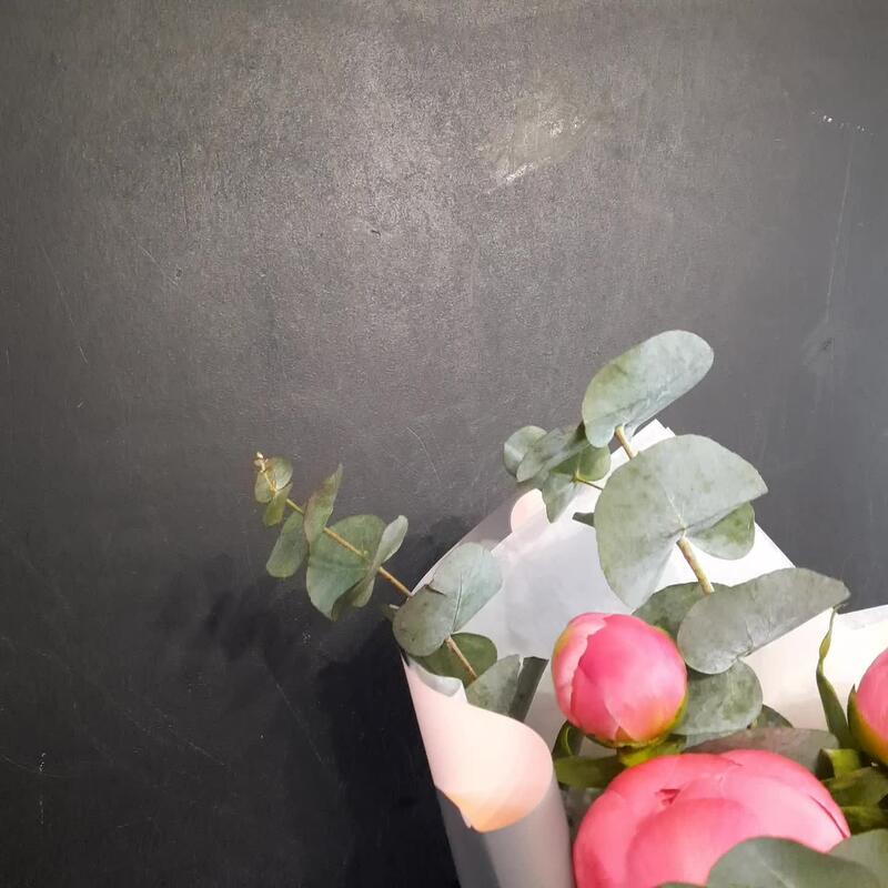 Пион Коралл Шарм (Coral Charm) – 3 шт.Эвкалипт – 1 шт.Упаковка дизайнерская – 1 шт.