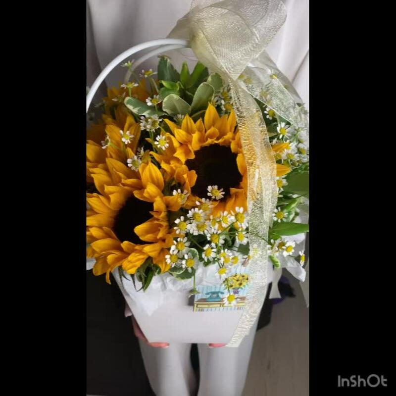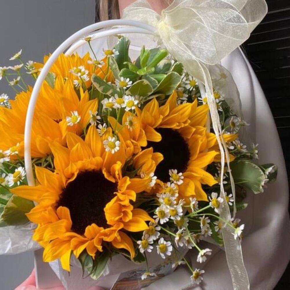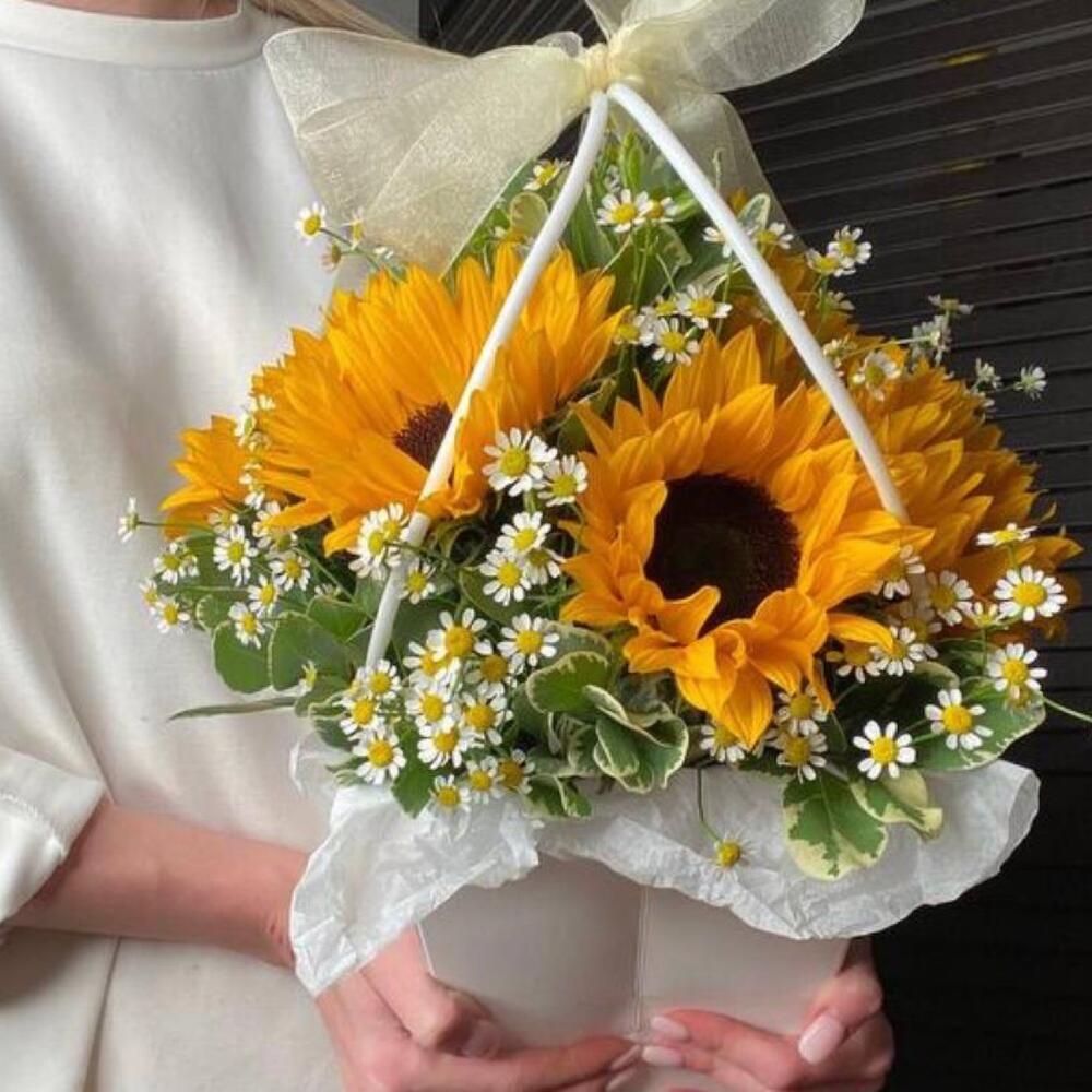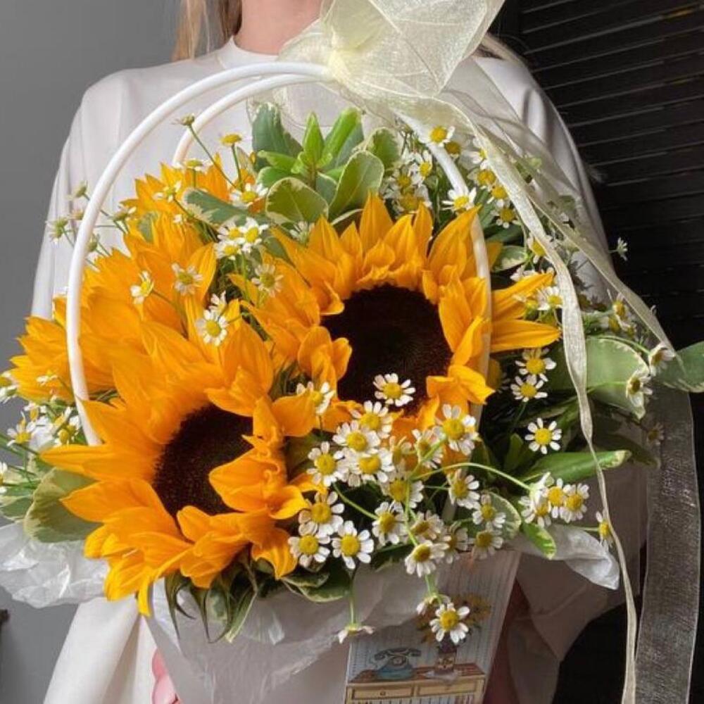 Питтоспорум – 6 шт.Ромашка – 10 шт.Подсолнух – 5 шт.Сумочка – 1 шт.Оазис флористический – 1 шт.Тишью белое – 1 шт.