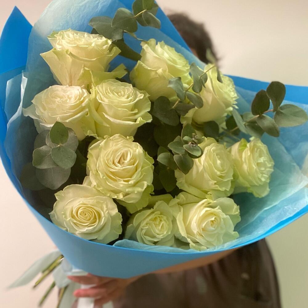 Эвкалипт – 2 шт.Роза – 11 шт.Лента атласная – 1 шт.Упаковка дизайнерская – 1 шт.