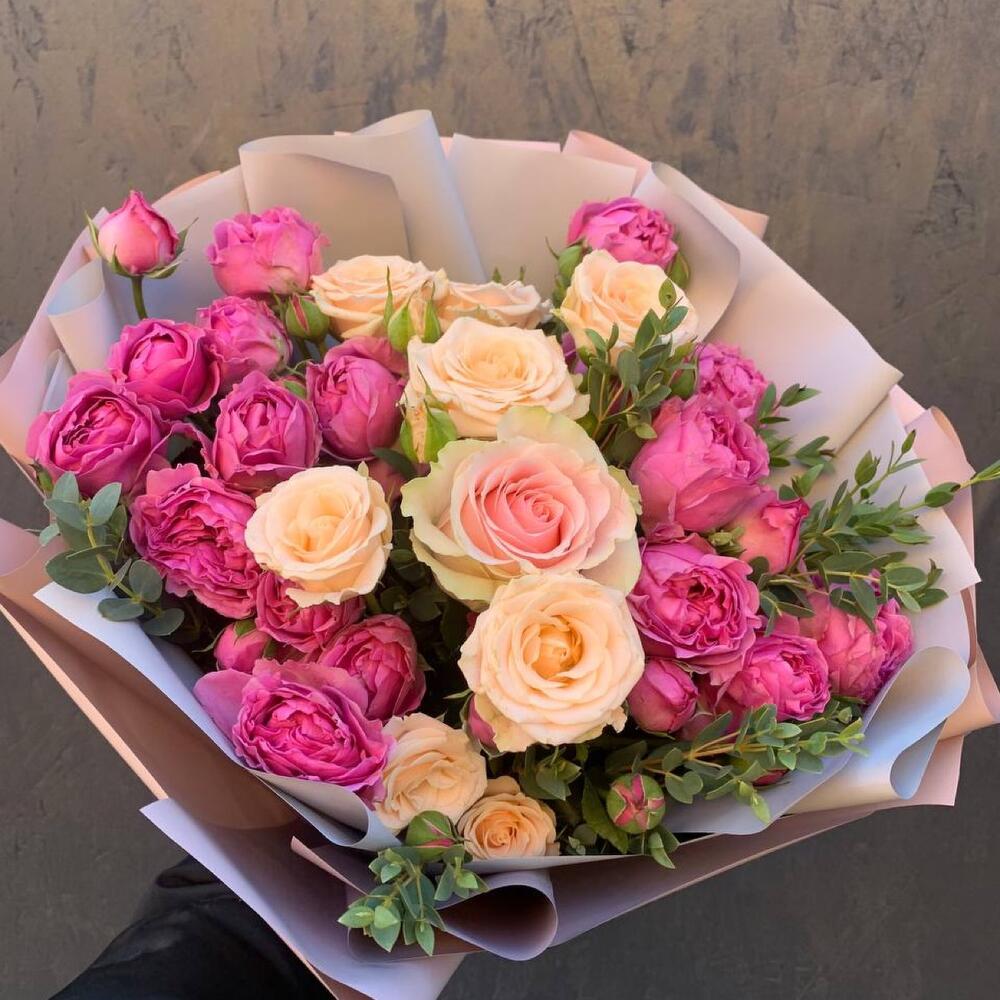 Букет пионовидных роз с кустовыми и эвкалиптом