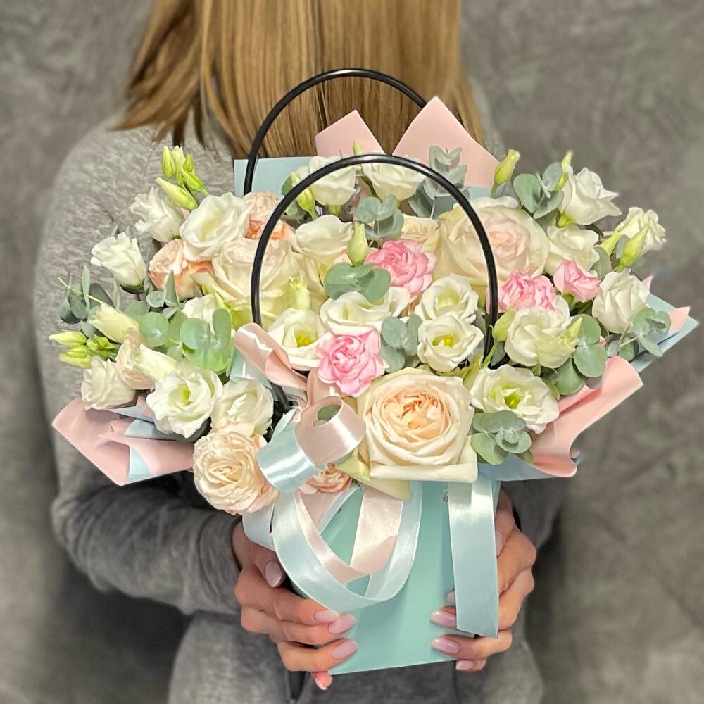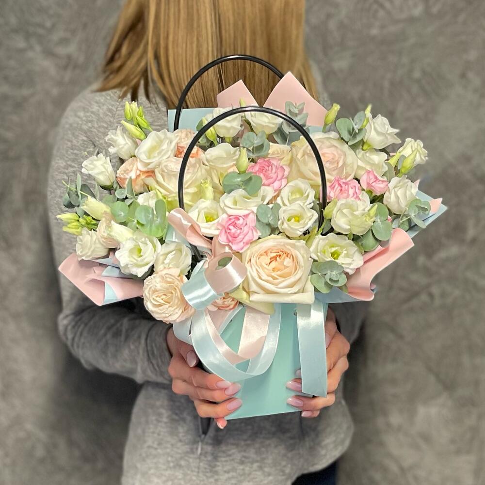 Пионовидная роза – 3 шт.Лизиантус – 3 шт.Кустовая роза Бомбастик – 2 шт.Диантус кустовой – 3 шт.Эвкалипт Baby Blue – 15 шт.Сумка – 1 шт.Оазис – 1 шт.