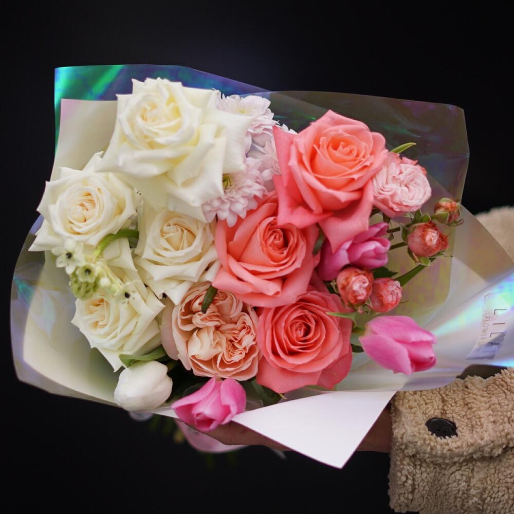 Роза цветная – 7 шт. Роза пионовидная – 1 шт. Кустовая роза – 2 шт. Тюльпан – 3 шт. Хризантема – 3 шт. Орнитогалум – 1 шт. Упаковка дизайнерская – 2 шт. Открыточка с вашими пожеланиями – 1 шт. инструкция по уходу за цветами – 1 шт.