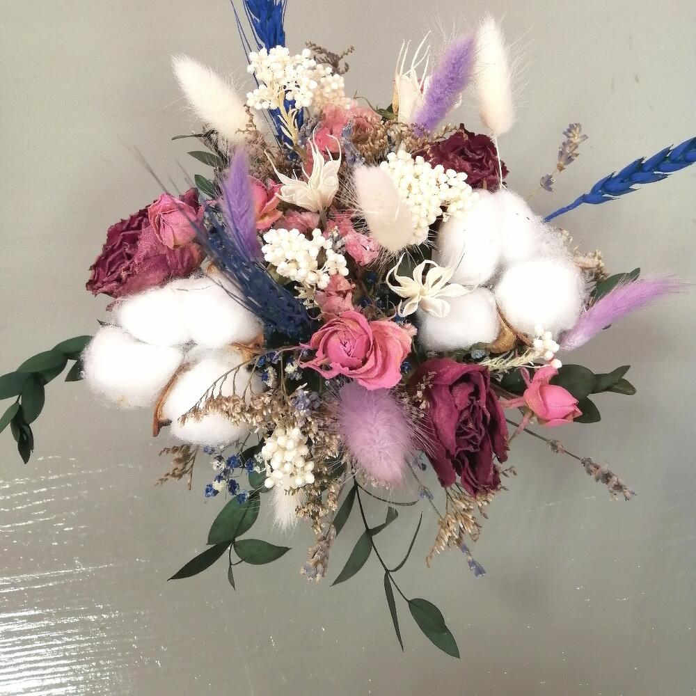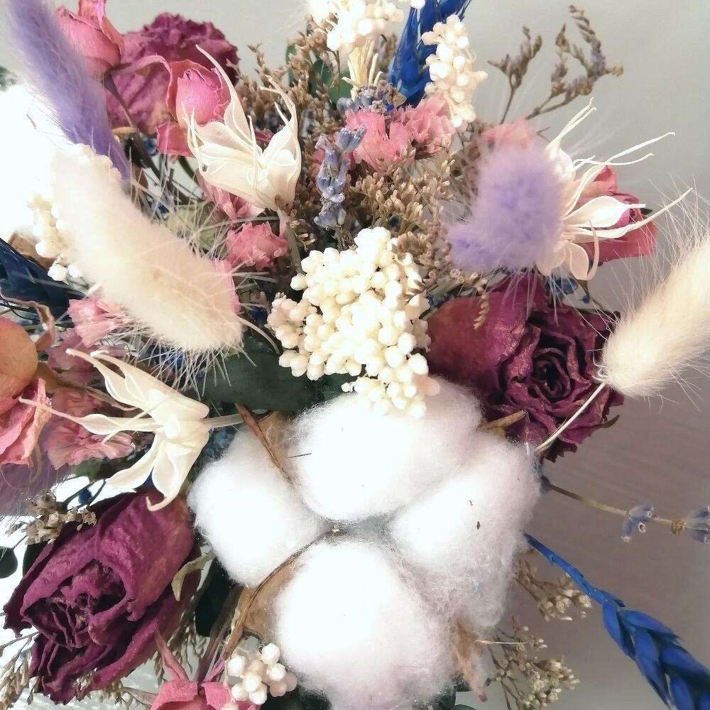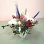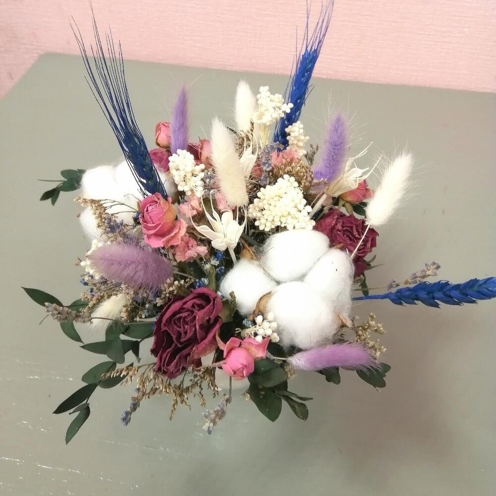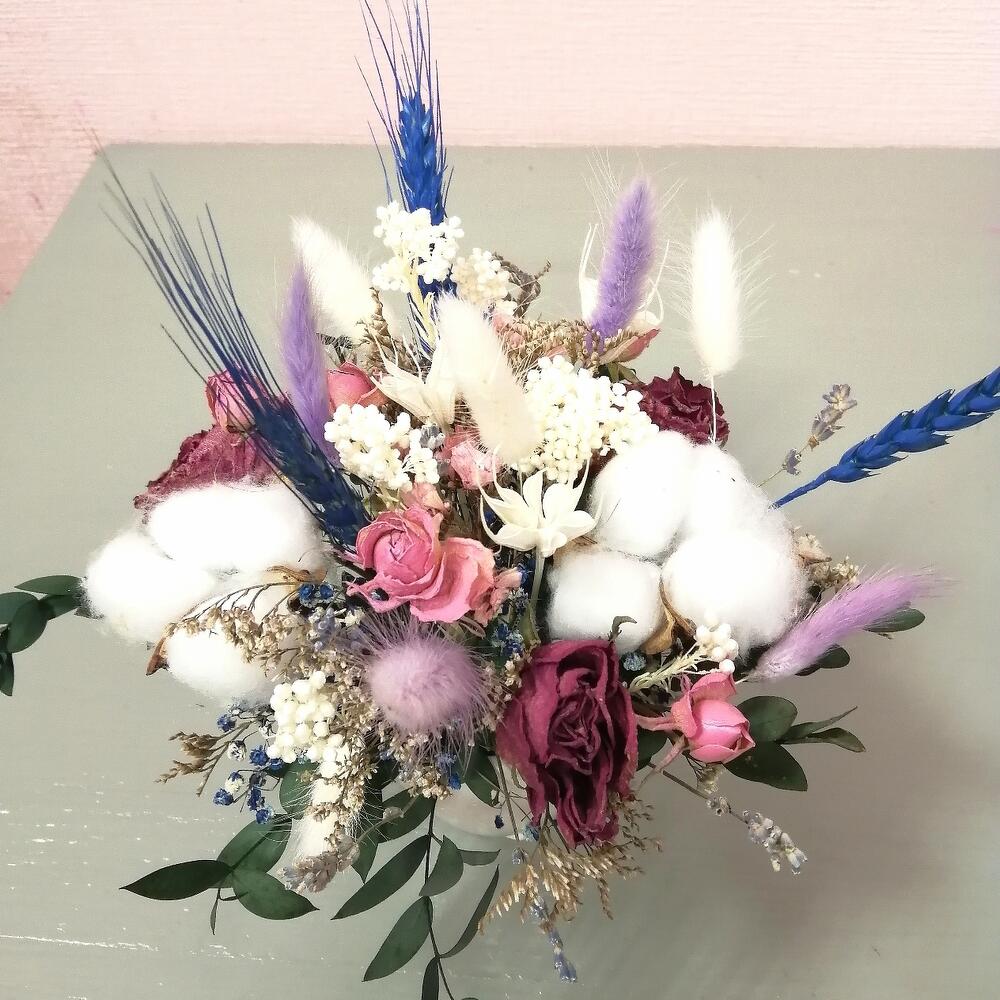 Лагурус – 8 шт.Колосья – 3 шт.озотамнус стабилизированный – 2 шт.Хлопок натуральный – 2 шт.Эвкалипт – 1 шт.Роза кустовая сухоцвет – 1 шт.гипсофила радужная – 1 шт.зелень декоративная – 6 шт.Оазис флористический – 1 шт.Кашпо керамическое – 1 шт.