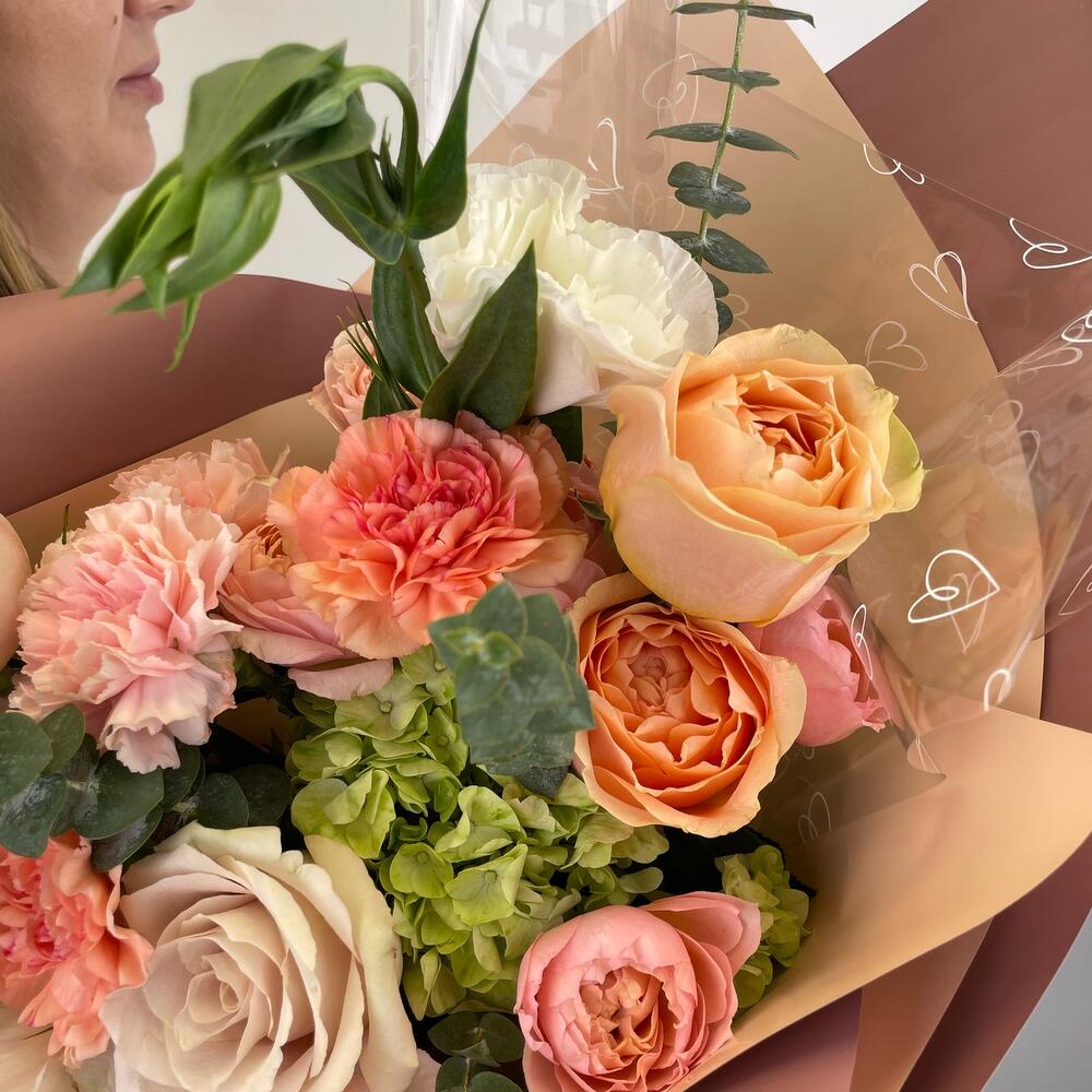 Гортензия – 1 шт.Диантус – 5 шт.Роза пионовидная – 4 шт.Упаковка дизайнерская – 3 шт.эустома белая – 2 шт.Эвкалипт Baby Blue – 6 шт.Кустовая роза пионовидная – 2 шт.