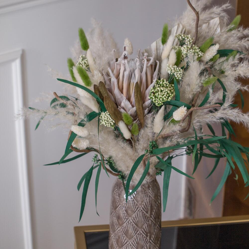 Протея – 1 шт.Ваза – 1 шт.кортадерия – 1 шт.Лагурус – 20 шт.стабилизированный эвкалипт ветка – 10 шт.